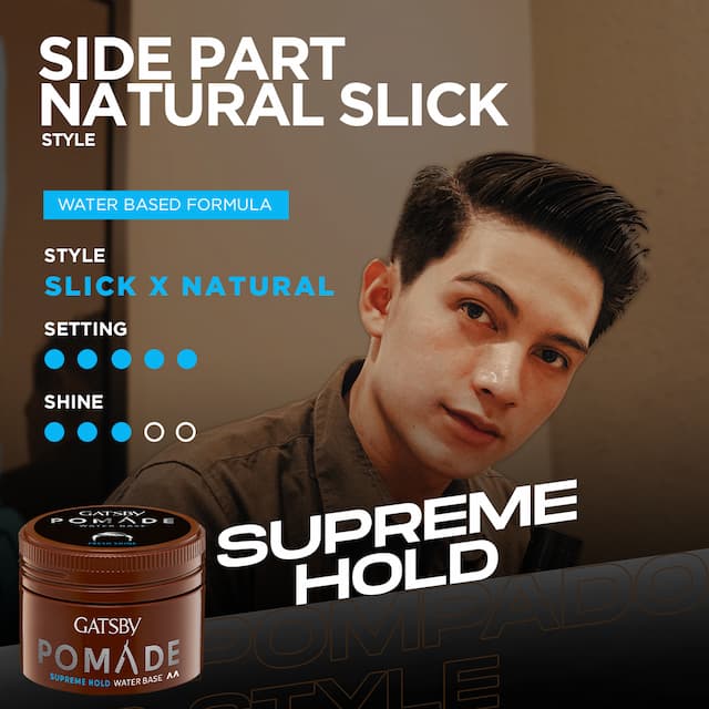 Pomade ini terbuat dari bahan dasar air, jadi cocok banget buat kamu yang suka gaya rambut side part. Dengan teknologi Water Slick Technology, pomade ini membantu menjaga rambut tetap rapi dan teratur, serta memberikan kilau fresh yang nggak berlebihan. Selain itu, pomade ini juga gampang dibersihkan, jadi kamu nggak perlu khawatir soal sisa produk yang bisa nyumbat pori-pori kulit kepala.